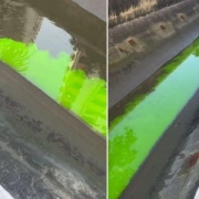 Um líquido verde fluorescente, usado para detectar infiltrações em piscinas, apareceu no canal da Avenida General San Martin, na ponta da praia, em Santos. A prefeitura identificou o condomínio responsável pelo descarte irregular e aplicou uma multa.